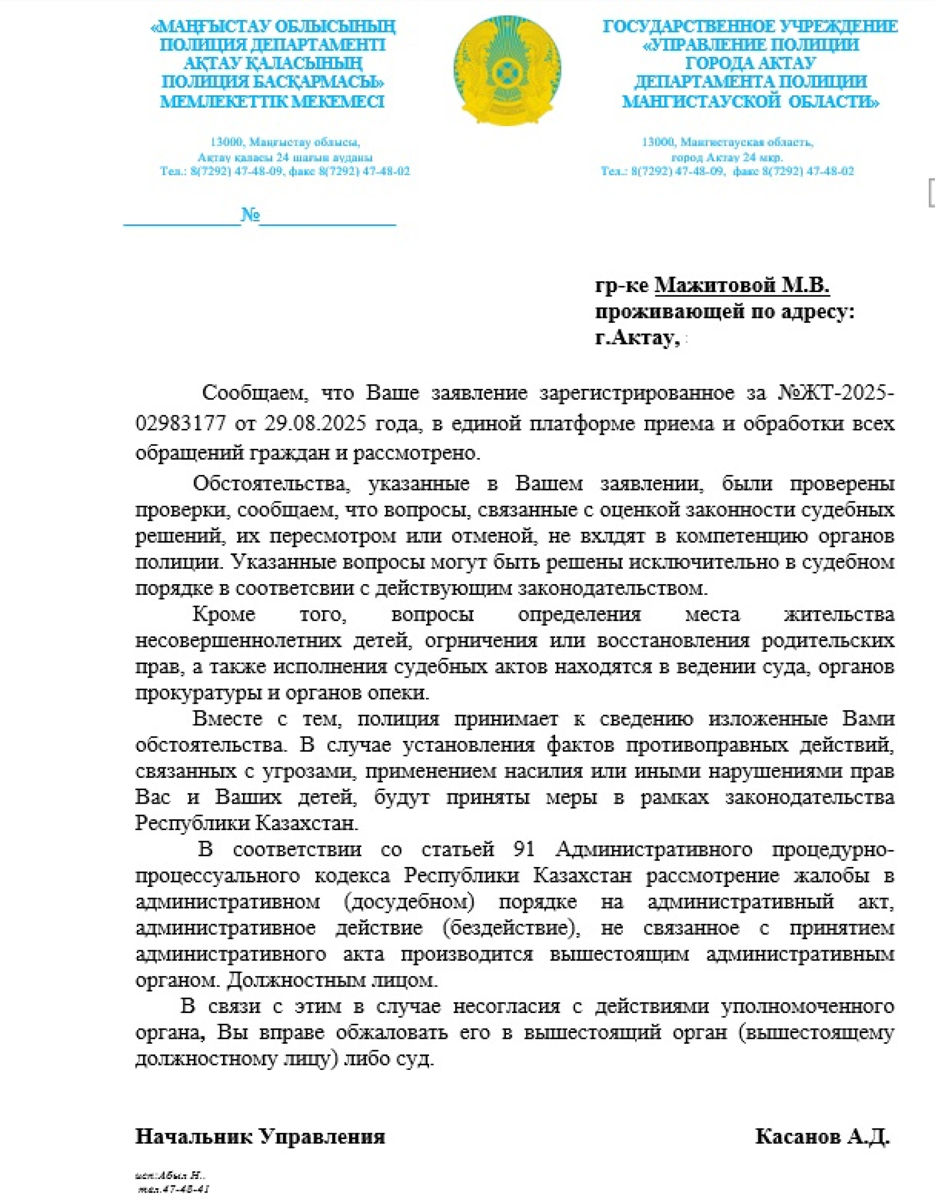 Женщина утверждает, что даже несмотря на наличие всех необходимых документов, включая решение суда, подтверждающего место жительства ребёнка с ней, правоохранительные органы и судебные исполнители не проявляют активности в расследовании её дела. «Я кричу о помощи, а система молчит. Никаких действий не было сделано», — выражает она своё возмущение, добавляя, что обращение в департамент полиции Мангистауской области не дало результатов.