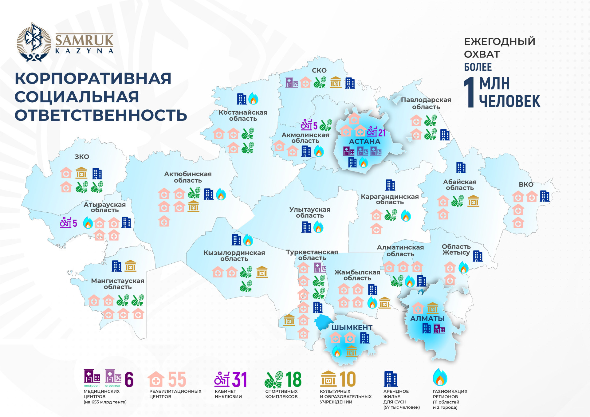 Социальные программы, реализуемые через фонд Samruk-Kazyna Trust, включают в себя создание реабилитационных центров для детей с особыми потребностями, открытие инклюзивных классов в школах и строительство спортивных залов в отдалённых регионах. Также медицинские работники выезжают в самые удалённые населённые пункты Казахстана.
