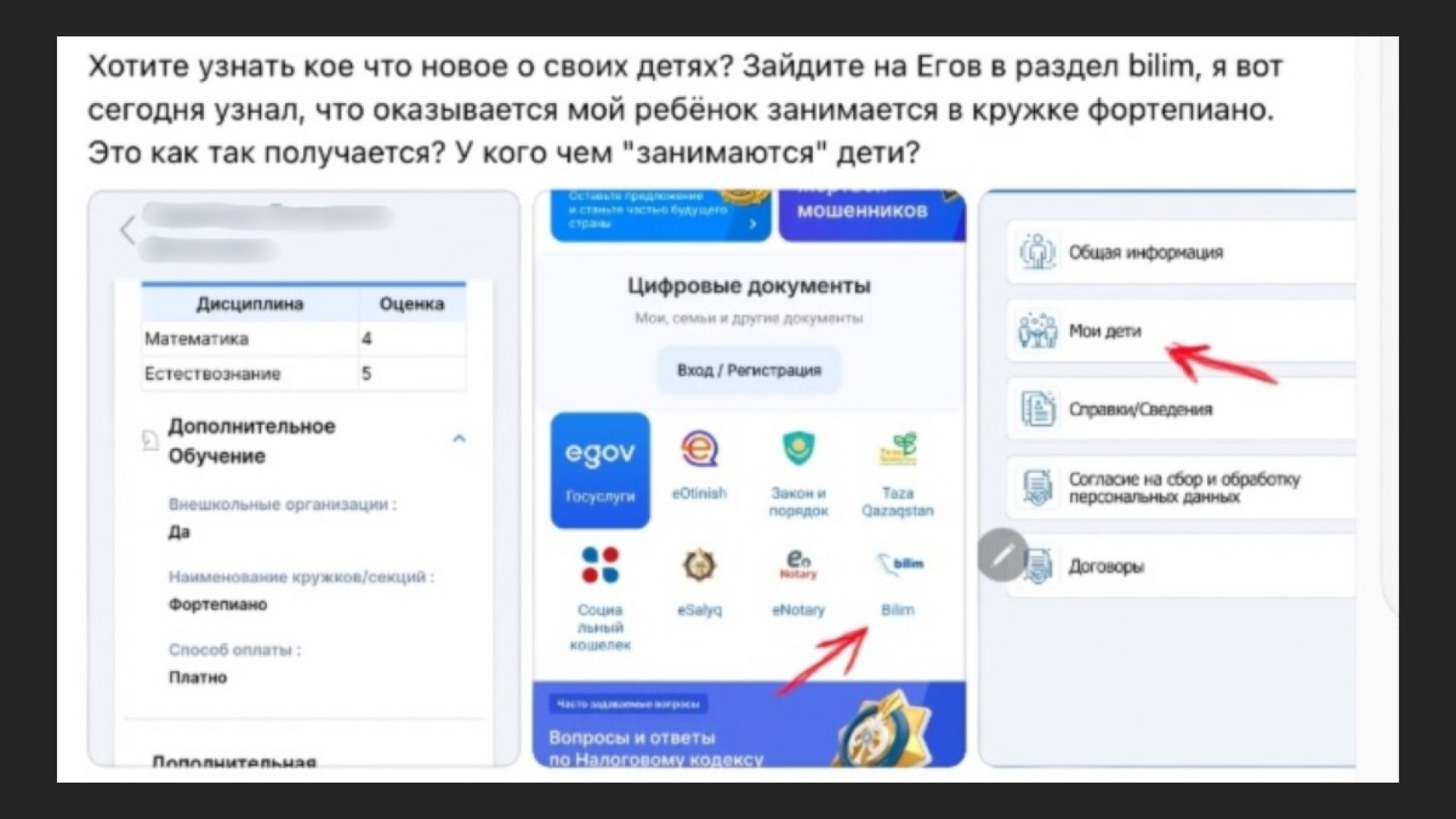 Пост одного из родителей в социальной сети Threads собрал более 46 тысяч просмотров. Он поделился, что, изучая раздел Bilim в приложении eGov, обнаружил, что его ребёнок якобы посещает уроки игры на фортепиано, хотя на самом деле этого не происходит.