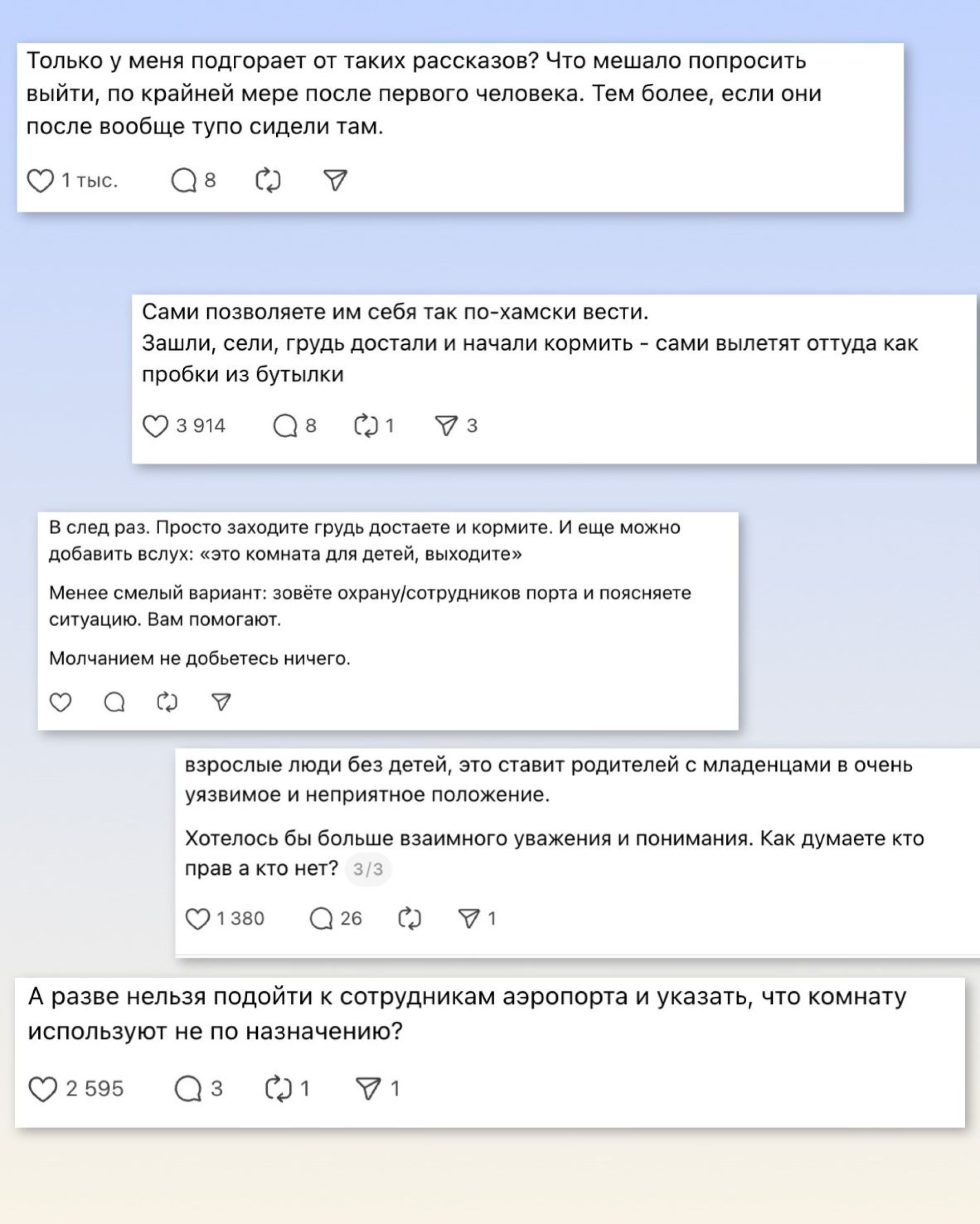 Согласно информации, сотрудники аэропорта обязаны быстро реагировать на подобные обращения и обеспечивать освобождение помещения для родителей с детьми.
